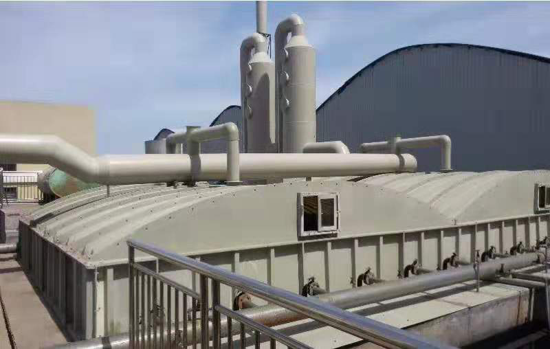 主要针对污水处理系统的厌氧、好氧、收集池、沉淀池等一些敞开的废水池进行密闭加玻璃钢盖板,对无组织排放废气进行有效收集,集中处理有组织达标排放。采用氧化+酸吸收、氧化+碱吸收工艺处理生化恶臭废气,处理后的废气达到恶臭物排放一级标准。